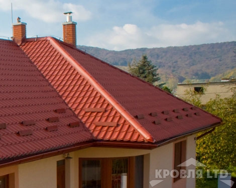 Коньковая планка монтируется в самой высокой точке строения. При монтаже коньковой планки обращайте особое внимание на то, что листы металлочерепицы не должны сходиться под коньковой планкой вплотную друг к другу. Воздушное пространство под коньком должно беспрепятственно вентилироваться потоком воздуха, идущего от карниза к коньку и от одного торца здания к другому.