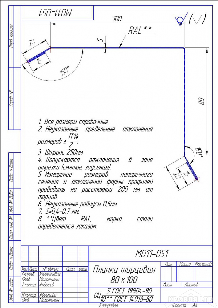 Планка торцевая 80х100, Цинк, толщина 0,45